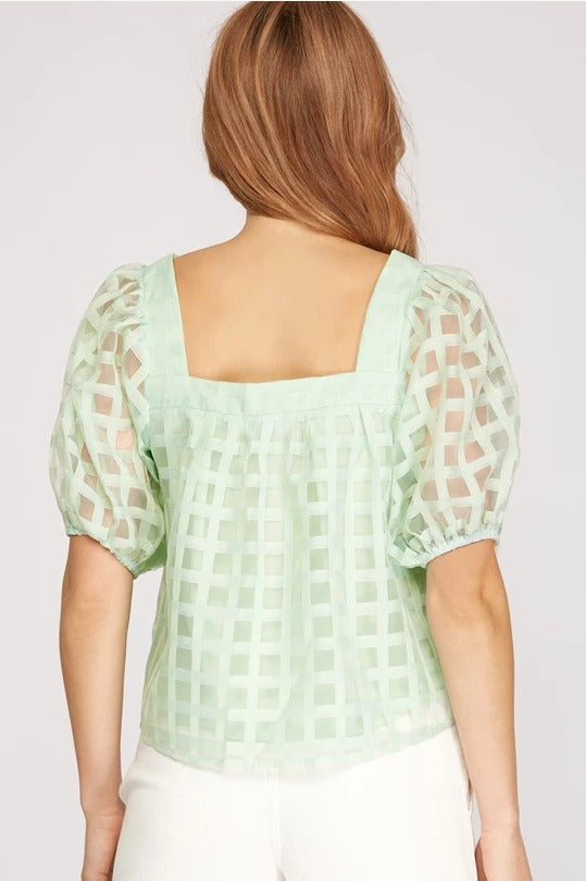 A blouse with a square neckline and short puff sleeves. The blouse features a grid pattern with a semi-sheer design, giving it an airy and stylish look.